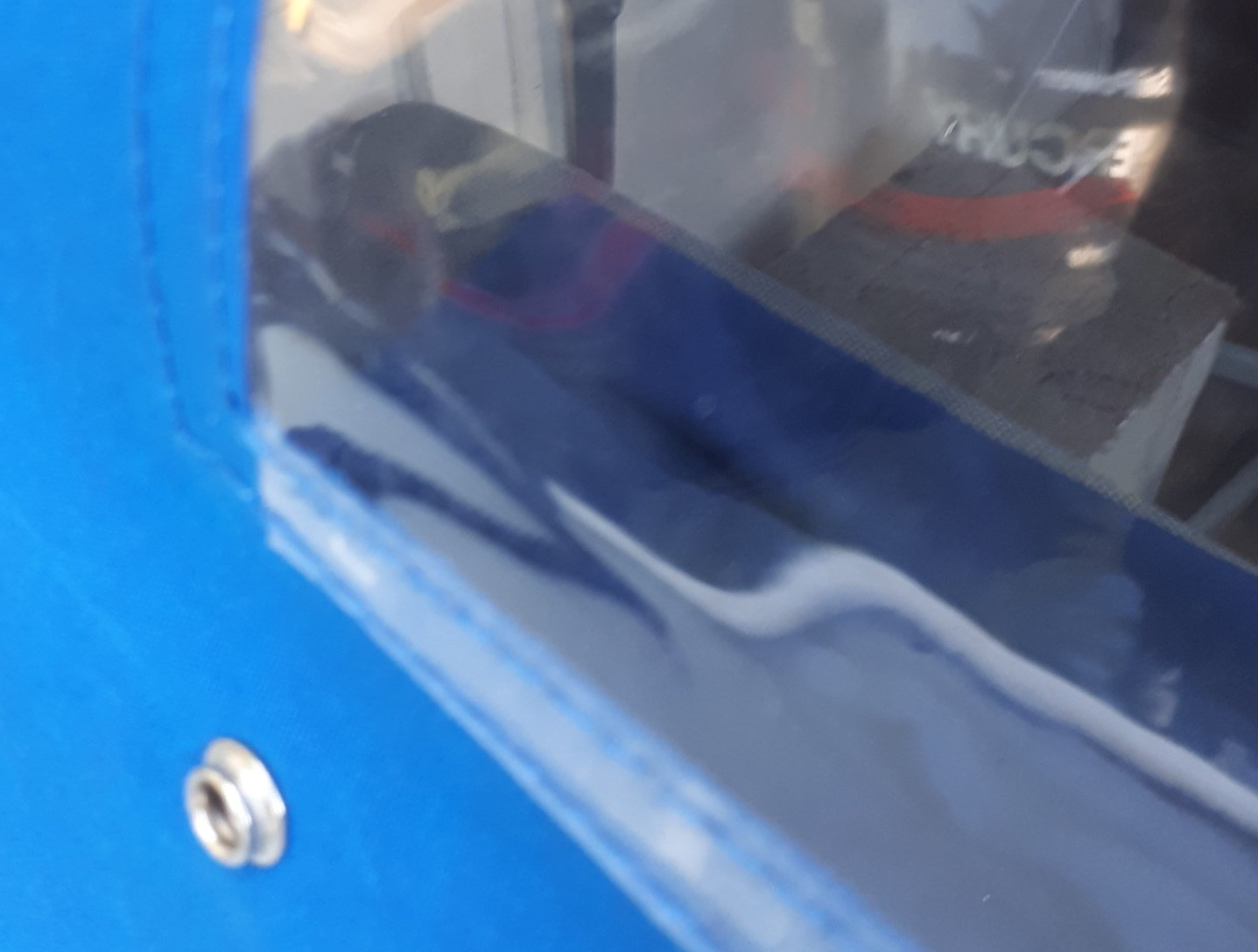 Im Bild sehen sie die Einarbeitung der Fensterfolie an der dafür vorgesehenen Stelle im Verdeckstoff. Die Folie wird zunächst mit einem schmalen doppelseitigen Tape eingeklebt und anschließend mit zwei Nähten fixiert. Zur Gewährleistung der Dichtigkeit, wird die Fensterfolie an den unteren Nähten leicht eingeschnitten und die entstehende Lasche über den Verdeckstoff hinweggeklappt (s.Bild). Dort wird sie ebenfalls mit Tape fixiert und doppelt vernäht. Herabfließendes Wasser (z.B. bei Regen), hat so keine Möglichkeit in den Innenraum zu gelangen. Darüber hinaus